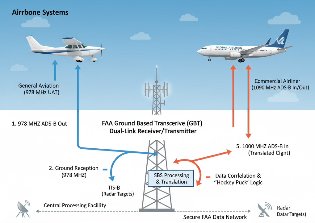 The integration of 978 MHz UAT transponder signals into an airline’s 1090ES ADS-B IN system is a complex yet elegant process that is not achieved through direct airborne communication. It is, instead, a sophisticated synthesis of data wholly dependent upon and orchestrated by the FAA’s terrestrial Surveillance and Broadcast Services infrastructure. Through the core translation service of Automatic Dependent Surveillance-Rebroadcast (ADS-R), complemented by the supplemental radar data from the Traffic Information Service-Broadcast (TIS-B), the ground network constructs a customized, unified traffic picture for each participating aircraft and uplinks it on the appropriate frequency.